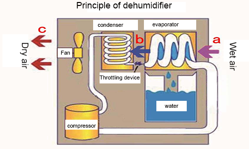 The wet air passes through the evaporator, cools down from a point along the iso-humidity line to 100% saturated humidity line (dew point temperature), then begins to precipitate water droplets, continues to cool down, and dehumidify along the saturated humidity line to point b, and then enters the condenser, and rises up from point b along the iso-humidity line to point c, and then exits the dehumidifier.